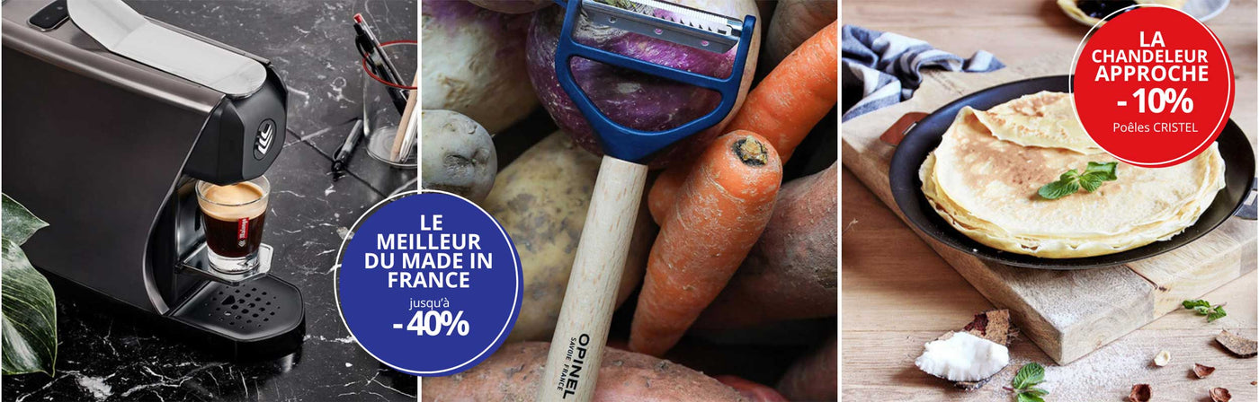 Nos fournisseurs, véritables partenaires du Comptoir de France sont tous répartis sur le territoire français du Nord de la France jusqu’en Provence, et de l’Alsace à la côte Atlantique. Maintenir le savoir-faire de chaque métier est important : nos couteliers fabriquent à la main chaque produit en une dizaine d’étapes et même davantage ! Chaque geste provient de l’héritage de l’artisanat français. Nos fabricants de casseroles en inox ou en cuivre ont leur usine en France. Si vous cherchez une poêle anti adhésive saine, non toxique et compatible avec l’induction, c’est Au Comptoir de France qu’il faut l’acheter. Les ustensiles de cuisine et les accessoires de cuisine au sens large, peuvent donc tous provenir de France, pour une consommation locale et responsable : moule silicone, passoire, spatule, éplucheur, économe, écumoire, ciseaux, mandoline, fouet…