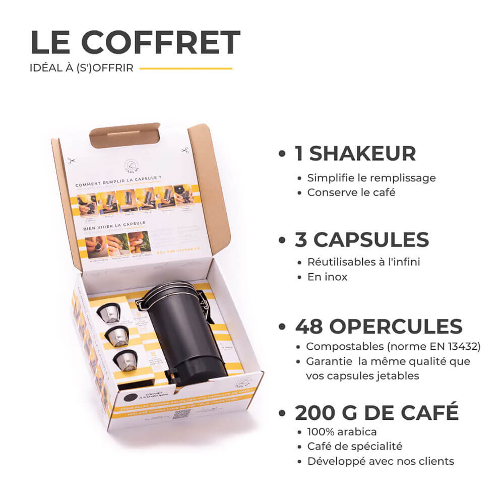 Médaille d'or du concours Lépine 2021, ce coffret CAPS ME permet de confectionner vous-mêmes vos capsules de café compatibles avec toutes les machines NESPRESSO©. Le système de capsule rechargeable en inox vous permet de faire de belles économies par rapport aux capsules jetables. Lavable et réutilisable, la capsule rechargeable réduit l'empreinte carbone. C'est meilleur pour la planète et pour votre portefeuille ! Ce coffret contient: