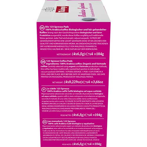 - Conditionnement : 16 dosettes de 104 g de café moulu et torréfié