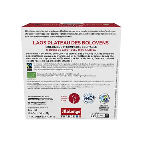 Compatible avec votre machine à café EOH Malongo, ce carton contient 16 dosettes de café en provenance du Laos. C'est un assemblage de variété arabica catimor et arabica typica qui fleurissent sur le Plateau des Bolovens, la source du café laotien. Certifié issu de l'agriculture biologique et du commerce équitable, grâce aux labels AB et Fairtrade Max Havelaar. Chaque dosette permet de déguster rapidement une tasse de café équilibrée aux aromes fruités intenses. Sa concentration en caféine est plutôt moyenne, pour une dégustation tout au long de la journée. Il est légèrement acidulé, riche et vous invite à voyager au cœur de l'histoire du café.