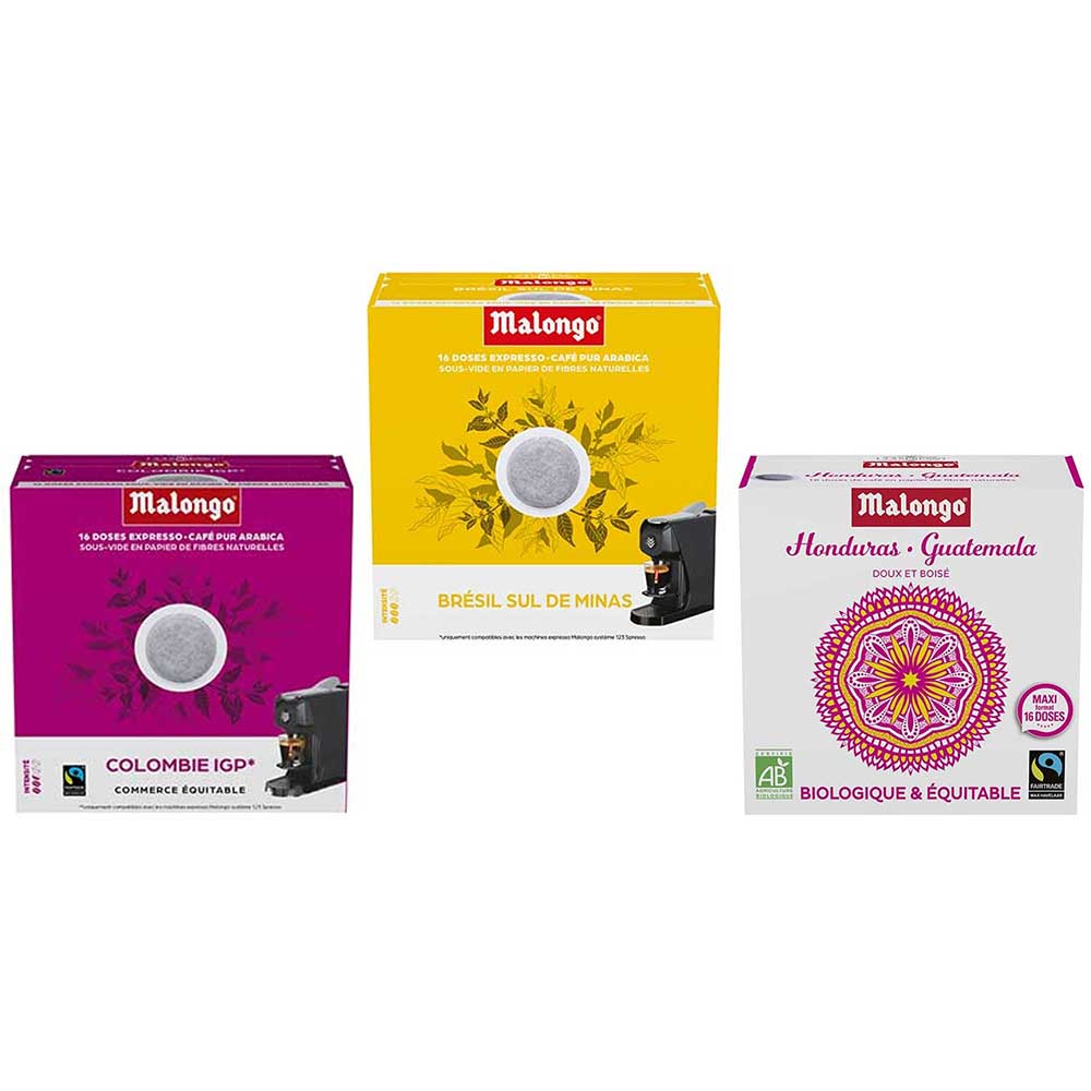 Lot de 48 dosettes de café Malongo compatibles avec votre machine à café EOH. Ces 3 sortes de café ont des puissances et intensités différentes, idéales pour vous accompagner toute la journée: le matin, un bon réveil avec le café de Colombie, après-déjeuner un café du Brésil et enfin l'après-midi le café du Honduras/Guatemala.
