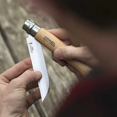 Ce couteau pliant OPINEL, simple mais performant, avec sa lame crantée de 12 cm en acier inoxydable et son manche en hêtre verni, est parfait pour couper le pain et trancher de gros fruits et légumes. Idéal pour la cuisine à la maison ou en plein air, le N°12 OPINEL Cranté est un outil pratique à la mer, en montagne ou en forêt. Un couteau de poche très pratique et sécurisant !