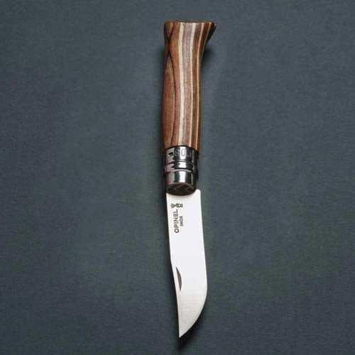 Très beau couteau de poche n°8 de chez OPINEL. Son manche en bois de bouleau est structuré en lamelles teintées en brun (sans produit toxique). Sa lame en inox ne nécessite pas d'entretien particulier. Un intemporel de chez OPINEL !