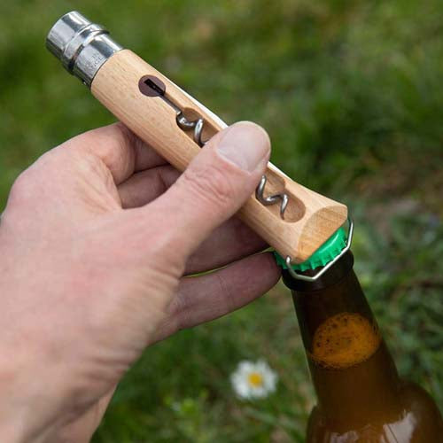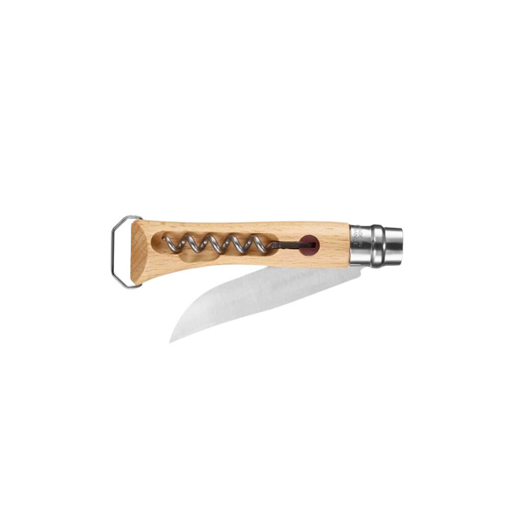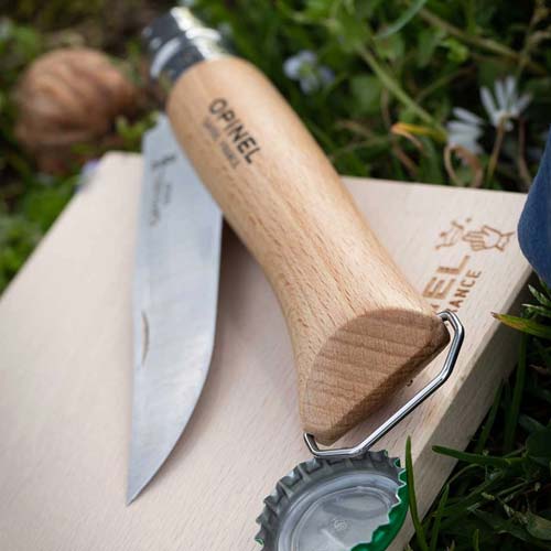 Le N°10 OPINEL est un couteau multifonctionnel idéal pour les pique-niques, avec une lame de 10 cm en acier inoxydable pour couper divers aliments, un manche en bois de hêtre intégrant un tire-bouchon à 5 spires et un décapsuleur. Il comprend aussi une bague de sécurité Virobloc et est fabriqué en France.