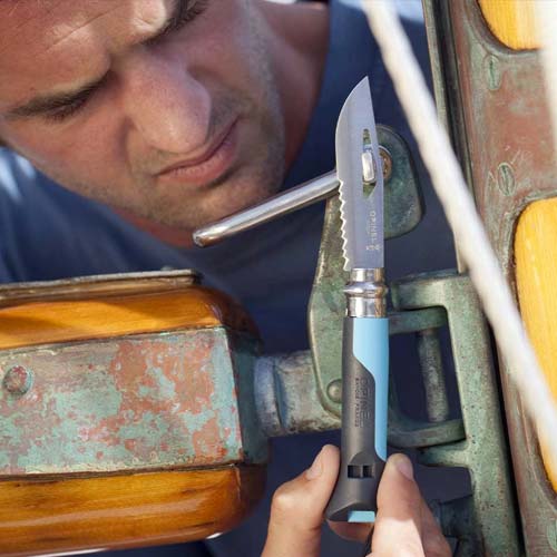 Ce couteau de poche Outdoor n°8 OPINEL, idéal pour les activités en extérieur, dispose d'une lame robuste de 2,5 mm d'épaisseur avec une section crantée de 3,5 cm efficace pour couper cordes naturelles ou synthétiques sans déchirure, et d'un démanilleur pour manilles de 4 à 10 mm. Son manche, résistant à l'eau et aux températures extrêmes, intègre un sifflet fonctionnel par tous les temps. Un couteau de poche polyvalent et fiable.