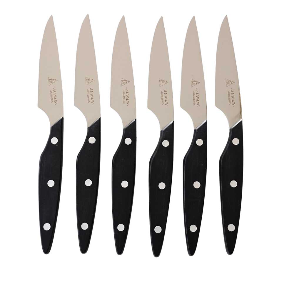 Coffret de 6 magnifiques couteaux à steak Brasserie AU NAIN. Leur lame micro-dentée est en acier inoxydable, leur manche en polyacétal noir avec 3 rivets pour toujours plus de solidité. Ces couteaux passent au lave-vaisselle et sont de fabrication française.