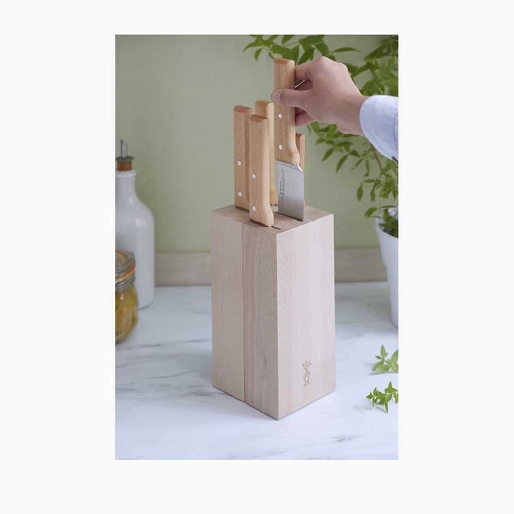 Ce bloc 5 couteaux Parallèle Viande de chez OPINEL s'intégrera parfaitement dans votre cuisine. Ces 5 couteaux ont des lames en inox et des manches en bois de Hêtre. Le bloc est également en bois massif. Il possède des patins en silicone pour protéger votre plan de travail et l'empêcher de glisser. Il comprend: