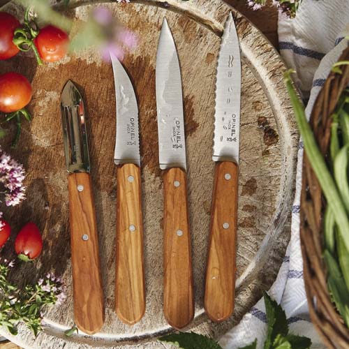 Ce coffret OPINEL inclut quatre petits couteaux à manche en bois d'olivier. Pratiques et efficaces pour un usage quotidien : le couteau d'office, le couteau cranté, le couteau à légumes et l'éplucheur vous aideront dans votre cuisine quotidienne.