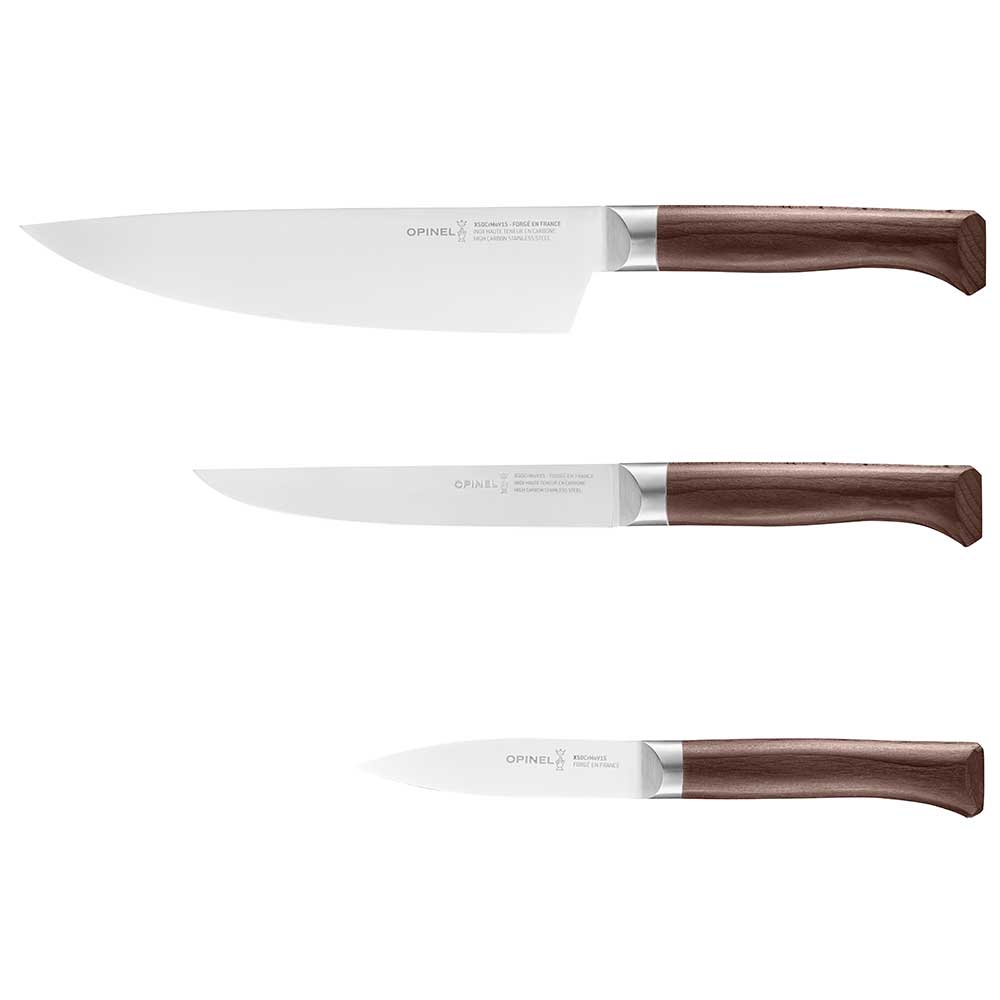 Magnifique coffret de 3 couteaux OPINEL en acier forgé. Le Haut de Gamme de chez OPINEL, ces 3 couteaux vous serviront longtemps en cuisine. On aime l'ergonomie des manches dont le design reprend le fameux couteau de poche n°8 d'OPINEL. Les manches sont en bois de hêtre teinté surmonté d'une mitre en acier. Ce Trio comprend: