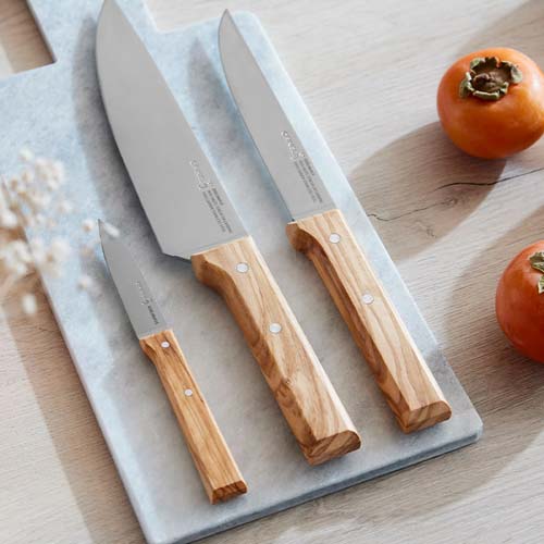 Ce coffret Trio Parallèle Olivier comprend 3 couteaux OPINEL avec manche en bois d'olivier, indispensables en cuisine:
