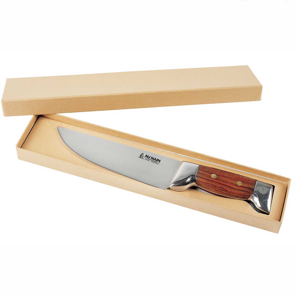 Ce magnifique couteau de campagne Au Nain est le reflet de l'artisanat du fabriquant de Thiers. Avec une lame tranchante en acier inoxydable Z40Cr13 de 21 cm, deux mitres en inox et un beau manche en bois rouge de kotibé, ce grand couteau est de qualité. C'est un couteau utile pour un barbecue ou pour vos découpes de pièces de viande.