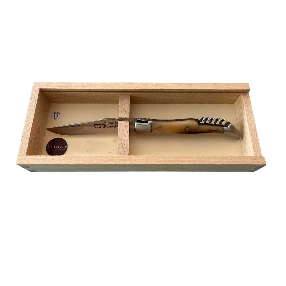 Magnifique couteau pliant Laguiole Prestige fabriqué en France par AU SABOT. Tout en acier forgé, la mitre et le ressort sont travaillés à la main. Ce couteau de poche possède un tire bouchon 5 spires en acier. Le manche est en pointe de corne véritable. Ce couteau de poche est livré dans un joli écrin en bois.