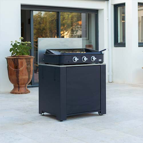 • Praticité et accueil de la plancha : 1 porte pour dissimuler la bouteille de gaz, découpes pour faire passer le tuyau du gaz.