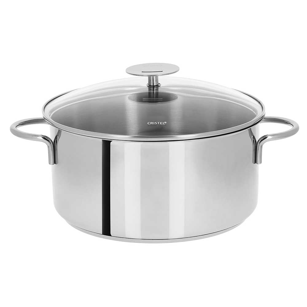 Magnifique faitout CRISTEL de la collection Mutine à poignée fixe en inox avec couvercle en verre inclus. Le fond qui comprend 3 couches de métal (inox - aluminium - inox), cuit parfaitement de façon homogène même sur l'induction. Le couvercle en verre peut être soulevé à la main ou avec une poignée CRISTEL.