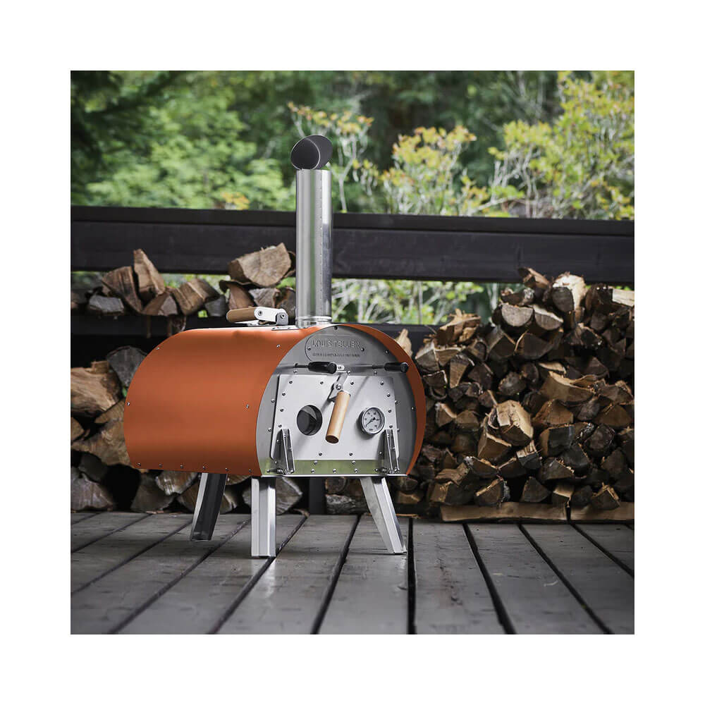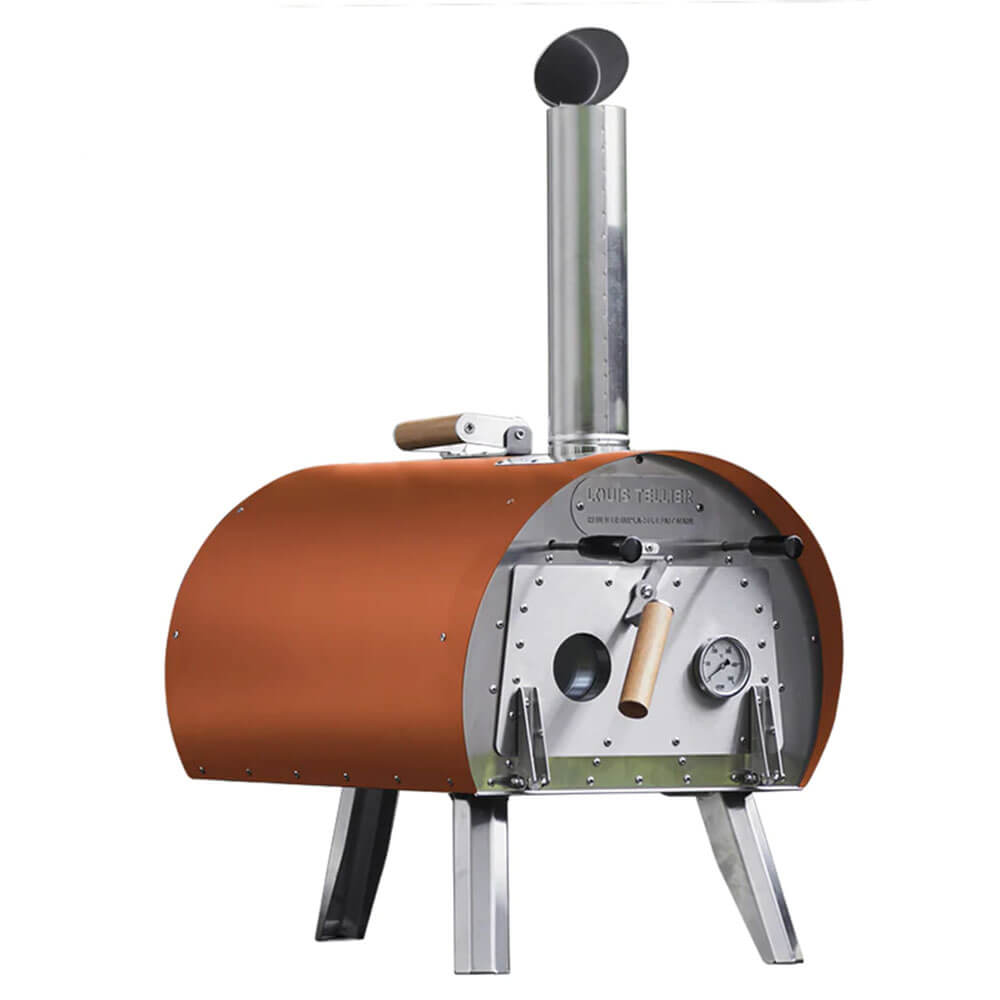 Four à bois MARCEL couleur corail du fabricant LOUIS TELLIER. On aime sa mise en chauffe rapide et sa facilité d'utilisation. On peut aussi bien faire cuire des pizzas (diamètre 30 cm), des côtes de bœuf et fumer à froid du saumon. Un vrai bijou pour les amoureux de cuisine d'extérieur.