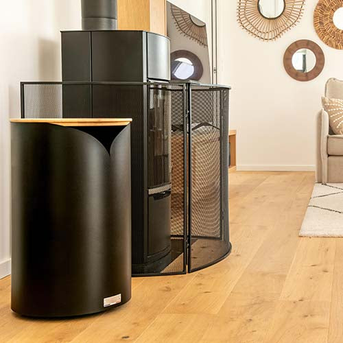 Gardez vos granulés à proximité pour alimenter votre poêle avec ce coffre à granulés Volute rond LE MARQUIER. Il peut contenir jusqu'à 30 kg (2 sacs) de granulés ou pellets. Il possède des roulettes pour le déplacer facilement. On aime son beau couvercle en bambou qui lui permet de servir de meuble ou de table, son format compact et son design sobre et élégant. Ce coffre à granulés est fabriqué à partir d'acier noir.