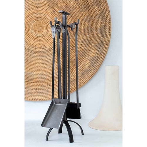 Serviteur de cheminée Trépied Acier Vernis LE MARQUIER en acier vernis. Il comprend une pelle, un balai, une pince et un tison. C'est un produit en acier fabriqué en France.