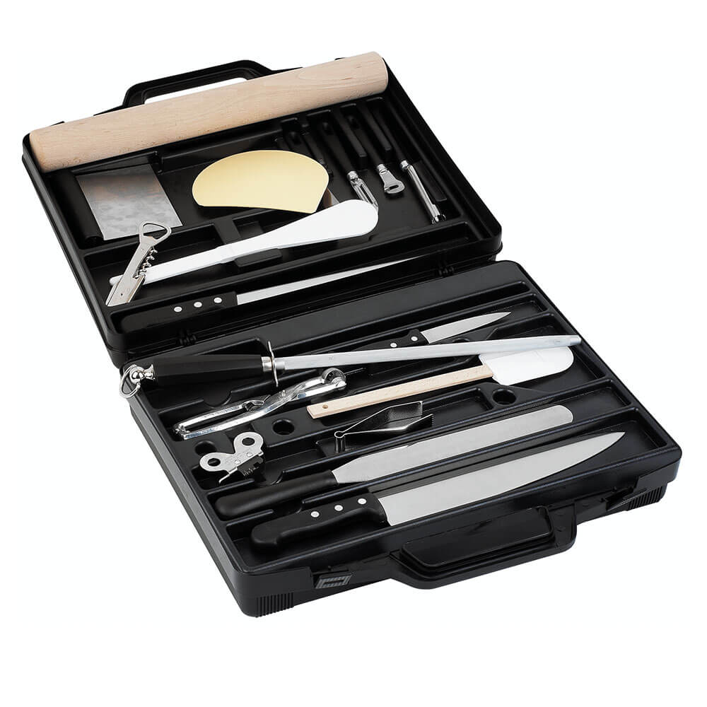 Cette mallette Ecole de Pâtisserie contient 19 pièces de qualité professionnelle: éminceur 25 cm, office 10 cm, couteau génoise 28 cm, fusil 30 cm, corne à ramasser, éplucheur, canneleur, ouvre-boîte, vide-pomme, limonadier, maryse de 25, dénoyauteur, zesteur, spatule 25 cm, spatule exoglass 25 cm, pince à pâte, rouleau hêtre, coupe-pâte souple et aiguille à brider.