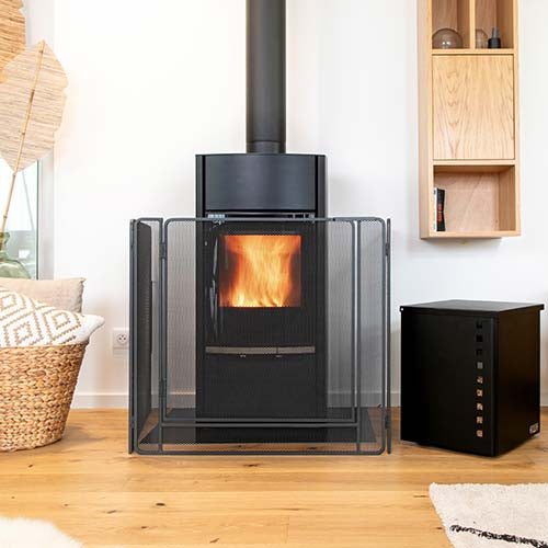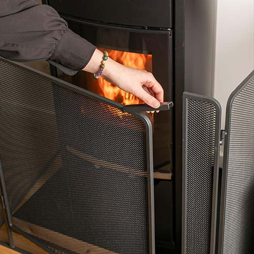 Très beau pare-feu Sécurité Marta XXL spécial poêle LE MARQUIER en acier peint gris foncé. Il est composé de trois volets (largeur 70-80-70 cm) qui s'orientent pour bien entourer votre poêle de cheminée (bois ou granulé), et d'une porte d'accès (61 x 56 cm). Ce pare-feu peut se fixer au mur à l'aide de 4 vis M6 et 4 écrous-frein M6.