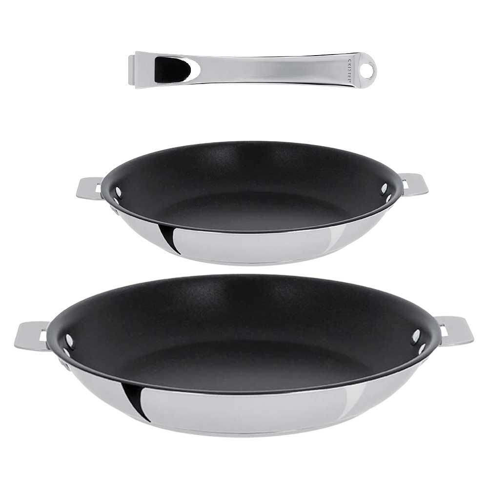 Ce lot de 2 poêles antiadhésives Casteline de chez CRISTEL est livré avec une poignée inox OFFERTE. Il vous suffit de choisir le diamètre des poêles adapté à votre cuisine.