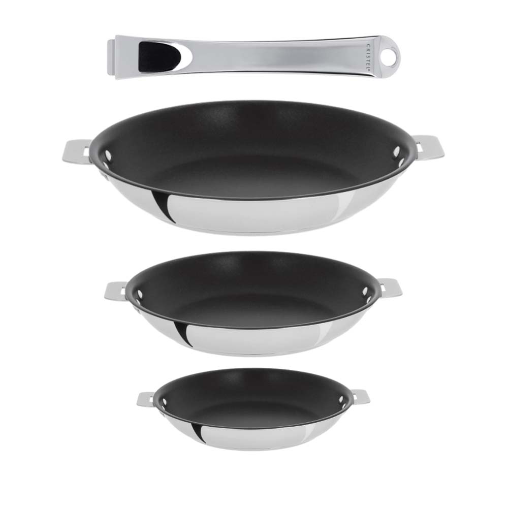 Cuisinez facilement et sans matière grasse avec ce lot de 3 poêles Casteline antiadhérente de la marque CRISTEL, livré avec une poignée inox offerte.